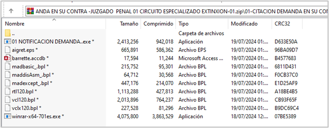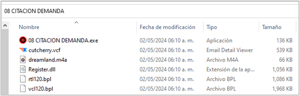 Este correo de la campaña tiene un archivo adjunto comprimido de tipo ZIP de nombre “08 CITACION DEMANDA.zip” el cual cumple la función de dropper de múltiples archivos.
