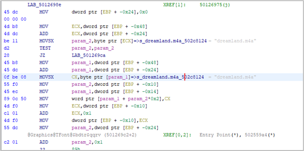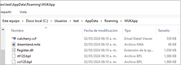 El ejecutable importa la función de la biblioteca BPL maliciosa; en el caso de las campañas analizadas la de nombre “vcl120.bpl”. Esta biblioteca ha sido previamente modificada por el actor de amenaza para importar artefactos que no corresponden a su funcionamiento regular. Aquí es donde se ejecuta un malware llamado HijackLoader o IDATLoader, el cual comienza a leer el contenido de un archivo que contiene el shellcode principal y corresponde al módulo principal de IDATLoader. En estas campañas, los nombres de estos archivos son “barrette.accdb”, “dreamland.m4a” y “battuta.flv”, para el ejemplo que se muestra en la siguiente figura se encuentra el nombre “dreamland.m4a”.