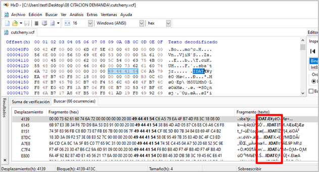 - Descifrado del payload: El archivo que contiene payload de IDATLoader es sencillo de identificar debido a que su técnica de cifrado incluye la palabra “IDAT” para segmentar el contenido; en las campañas analizadas son los artefactos con nombre “cutcherry.vcf”, “aigret.eps” y “maidenhair.cfg”. Cada segmento es descifrado individualmente utilizando la operación de XOR con una llave contenida inmediatamente después del primer flag “IDAT”. Posteriormente, junta todos los segmentos y los descomprime con el algoritmo LZNT1.