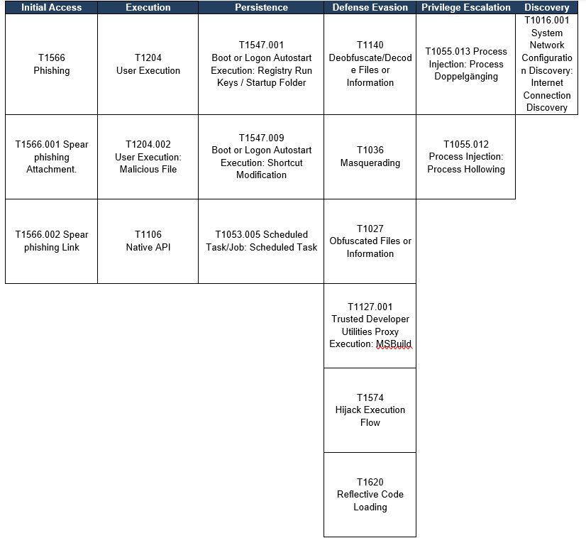 - Carga del payload: Mediante técnicas avanzadas conocidas como Process Doppelgänging y Heaven’s Gate, carga el contenido ya descifrado dentro de un proceso iniciado con privilegios elevados. En el caso de las campañas analizadas se carga el troyano AsyncRAT y el troyano Remcos en los procesos MSBuild.exe o explorer.exe.