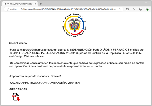 Esta campaña fue identificada por SCILabs. Del mismo modo que en la primera campaña, esta también se encontraba dirigida a Colombia y era distribuida mediante correos de phishing utilizando como pretexto una citación de demanda suplantando al Juzgado Tercero Laboral del Circuito de Colombia.