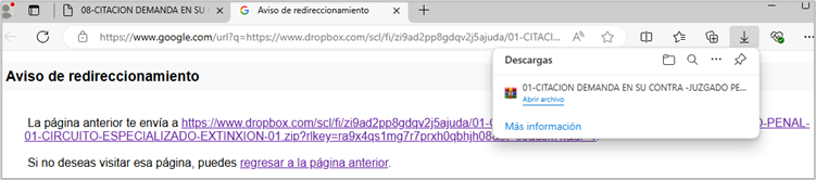 Una vez que el usuario pulsa en el enlace, este es redirigido a la descarga automática de un archivo comprimido desde un sitio legítimo de almacenamiento de Dropbox. Este archivo, al igual que en el caso anterior, es un archivo de tipo ZIP, en este caso, de nombre “01-CITACION DEMANDA EN SU CONTRA -JUZGADO PENAL 01 CIRCUITO ESPECIALIZADO EXTINXION-01.zip”.