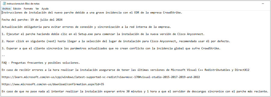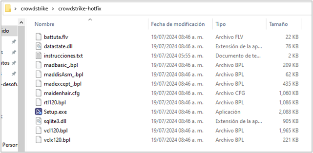 En el caso de esta campaña, SCILabs identificó una URL de almacenamiento de Dropbox a través de la cual es descargado un archivo comprimido de tipo ZIP con el nombre “crowdstrike-hotfix.zip”. Esta muestra corresponde con la muestra reportada por CrowdStrike a través de su blog. De acuerdo con su reporte, se desconoce el método de entrega, pero es probable que fuera parte de una campaña dirigida a Latinoamérica, utilizando como pretexto la actualización de software de CrowdStrike debido al fallo ocurrido el 19 de julio de 2024. En el contenido del artefacto se encontraba un archivo llamado “instrucciones.txt” en el cual se mencionaban supuestos pasos para ejecutar el parche, sin embargo, en realidad se trataba del ejecutable que realiza la infección del equipo.