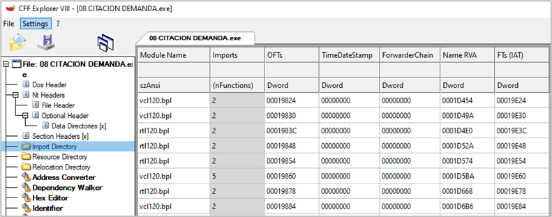 Este ejecutable importa las bibliotecas necesarias para el funcionamiento de la aplicación de acuerdo con el nombre; por lo tanto, una biblioteca BPL legítima puede ser sustituida fácilmente por una que ha sido modificada por el atacante. En las campañas analizadas se encontró el archivo malicioso “vcl120.bpl” en el mismo directorio del ejecutable.