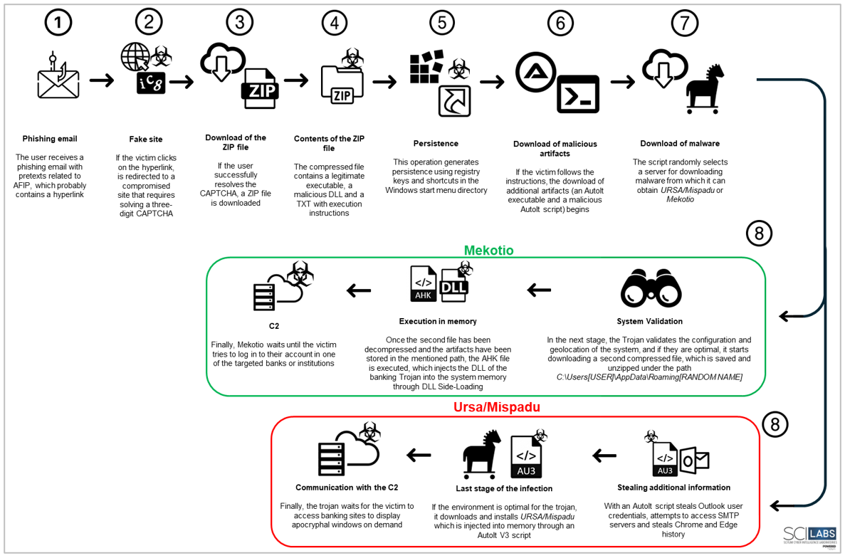 After carrying out the respective investigation, SCILabs determined that Operation Gecko Assault distributes URSA/Mispadu and Mekotio malware families. In addition, based on the impersonated institution and the name of the files it downloads, it is strongly possible that it is targeting Argentina.